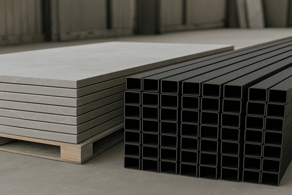 🔩Start with sintered stone slabs and sturdy steel frames.